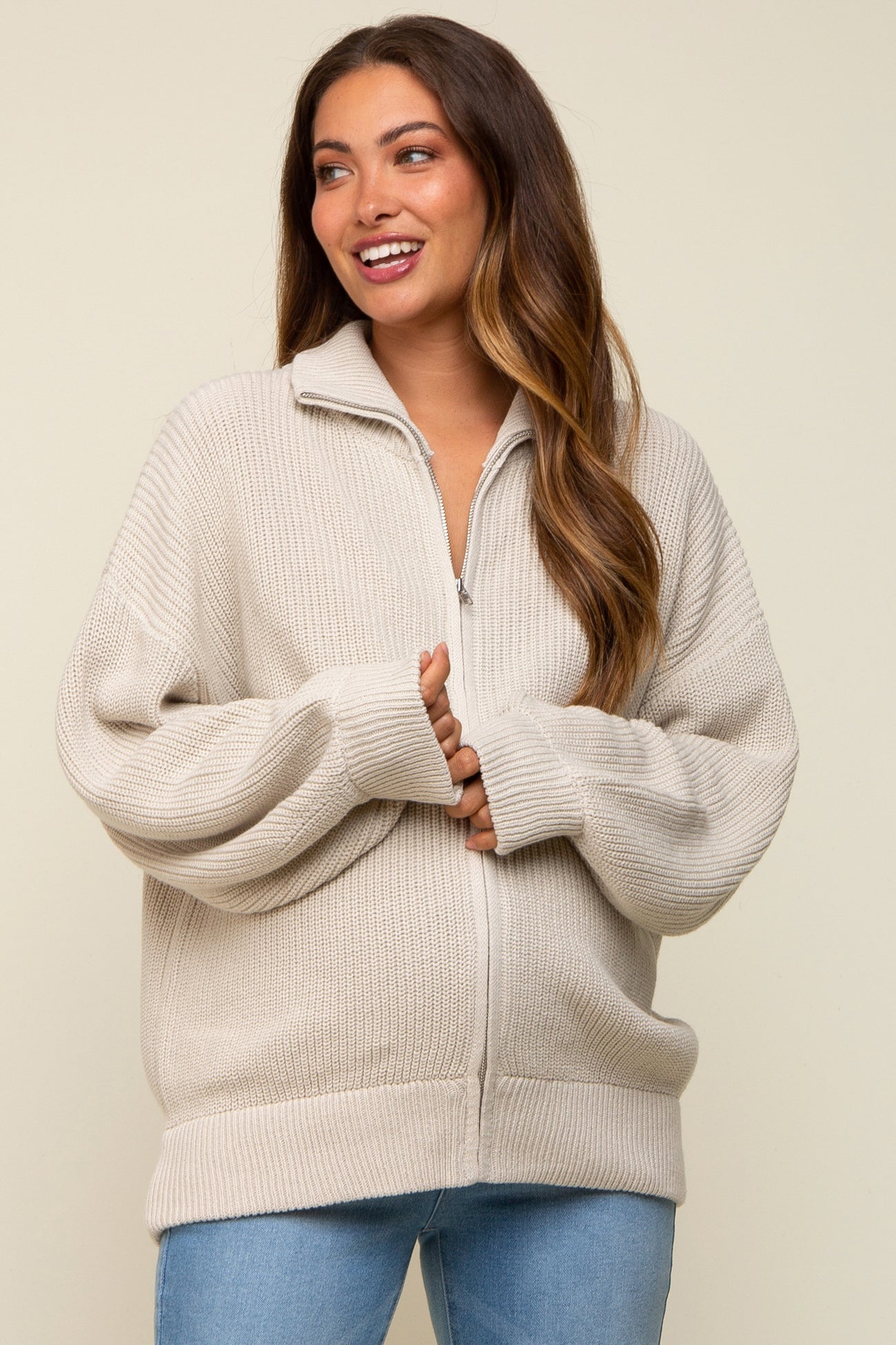 Taupe Oversized Zip Up Maternity Cardigan