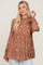 A floral babydoll top featuring a ruffle accent high neck, long cinched sleeves, an a back keyhole closure.