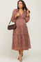 A floral maternity midi dress with a v-neckline, long cinched sleeves, front button accents, and a ruffle tiered skirt. Body of the dress is fully lined.