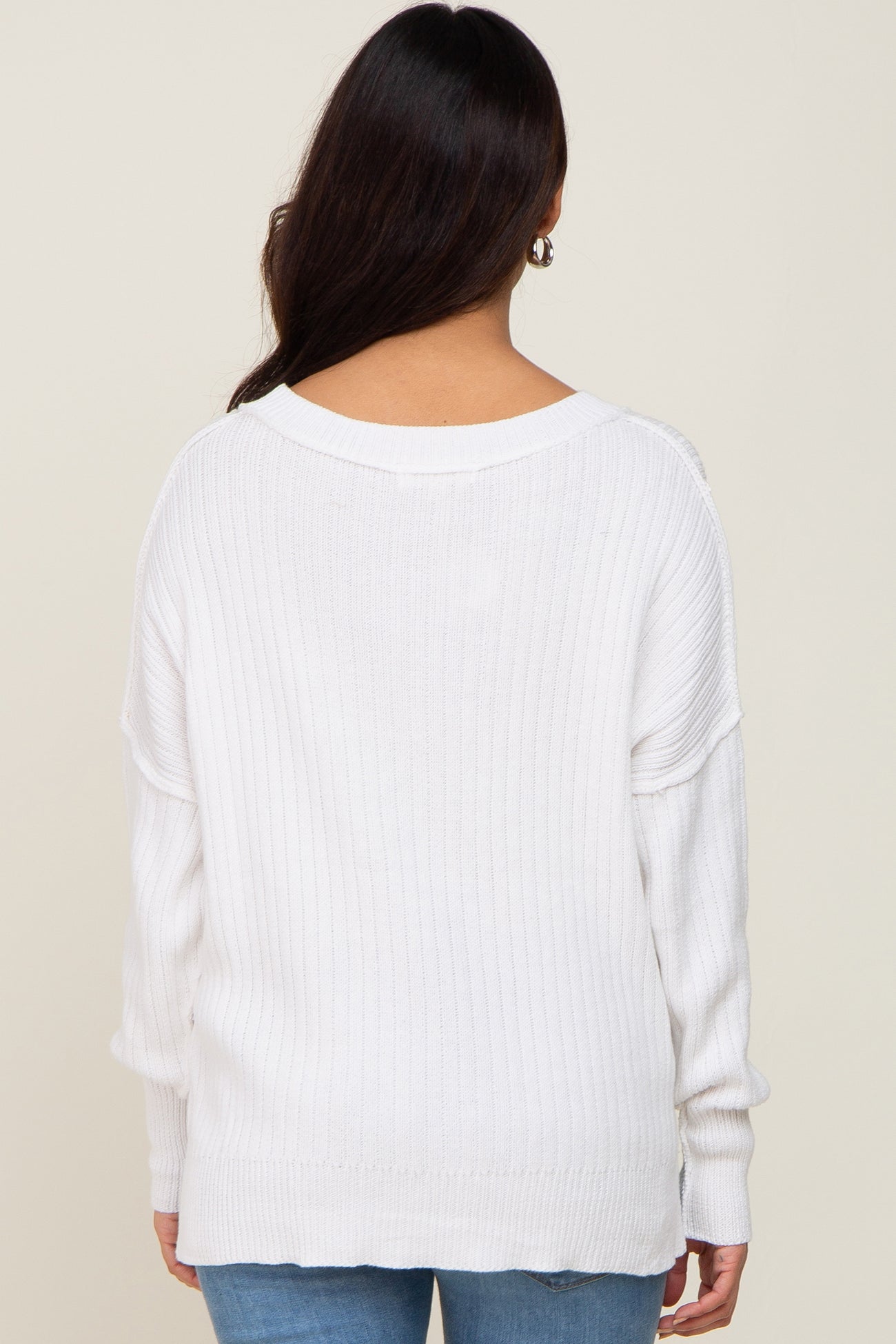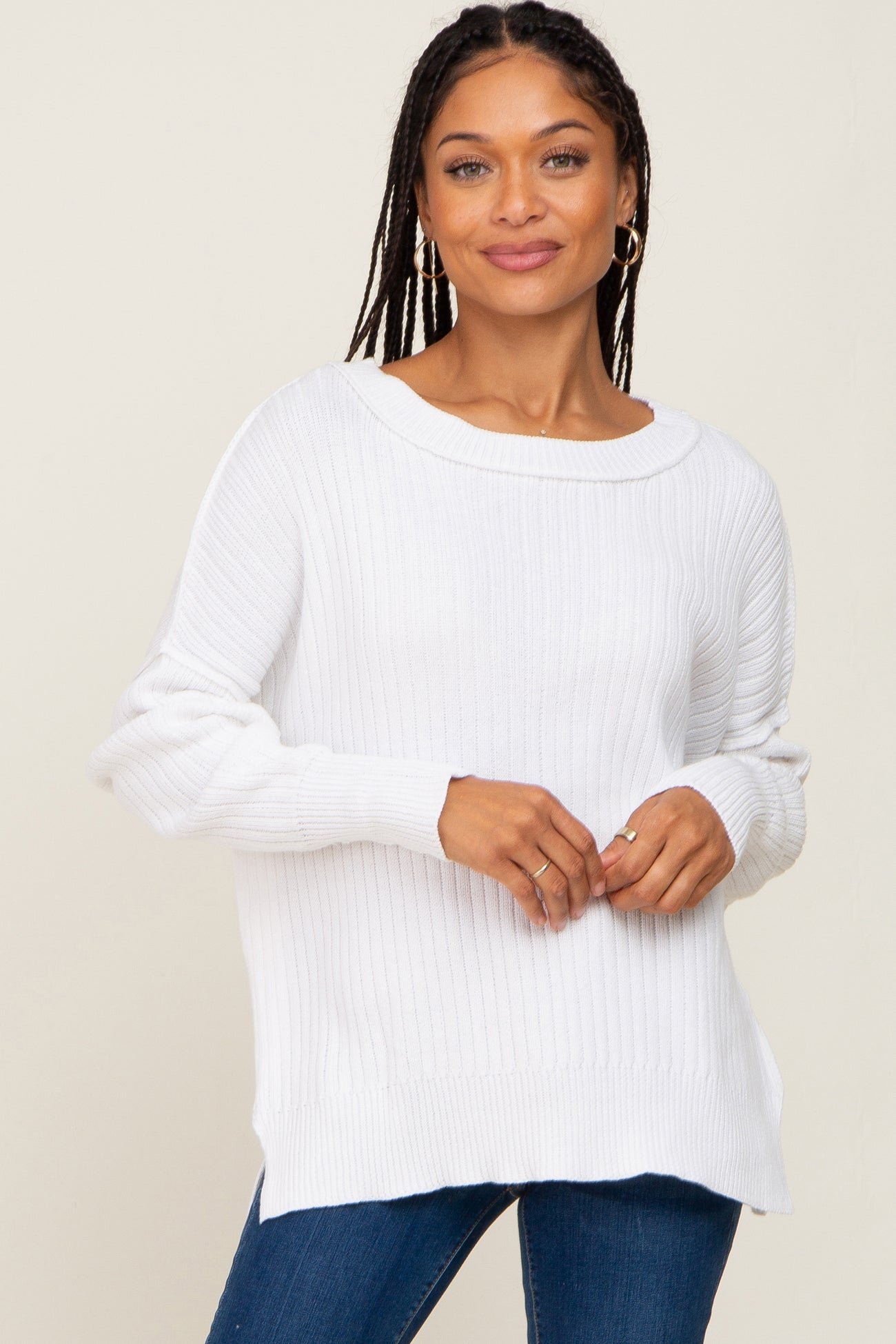 A solid long sleeve maternity sweater with a boat neckline, drop shoulders, long sleeves and side slits.
