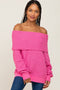 A solid off shoulder sweater with a foldover neckline in a chunky popcorn knit material.