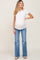A pair of maternity flare leg jeans with five pockets, a raw hem, slight distressing, and a full panel elastic belly band. Material has medium stretch.