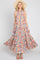 A sleeveless, floral maxi with a ruffle trim mock neck, side pockets, a tiered body, and a back neck tie.