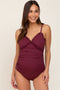 A ribbed one piece swimsuit featuring a ruffle v-neckline, side ruching, adjustable straps and a self-tie cutout back. Removable padding.