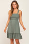 A sold crepe textured maternity dress. Features a smocked top, and gathered detailing at the waist and bottom hem.