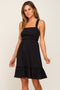 A sold crepe textured dress. Features a smocked top, and gathered detailing at the waist and bottom hem.