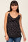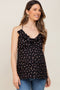 A floral print tank top with a ruffle accent v-neckline, crisscross back, and adjustable straps.