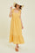 A midi dress with a squared neckline, adjustable ruffle accent straps, a back tie, side pockets, and a gathered bottom tier. Dress is lined