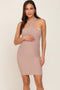 A solid knit maternity fitted mini dress with a crisscross halter neckline.