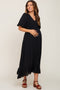 A solid maternity midi dress with a v-neckline, smocked bodice, and puff sleeves. Dress is partially lined.