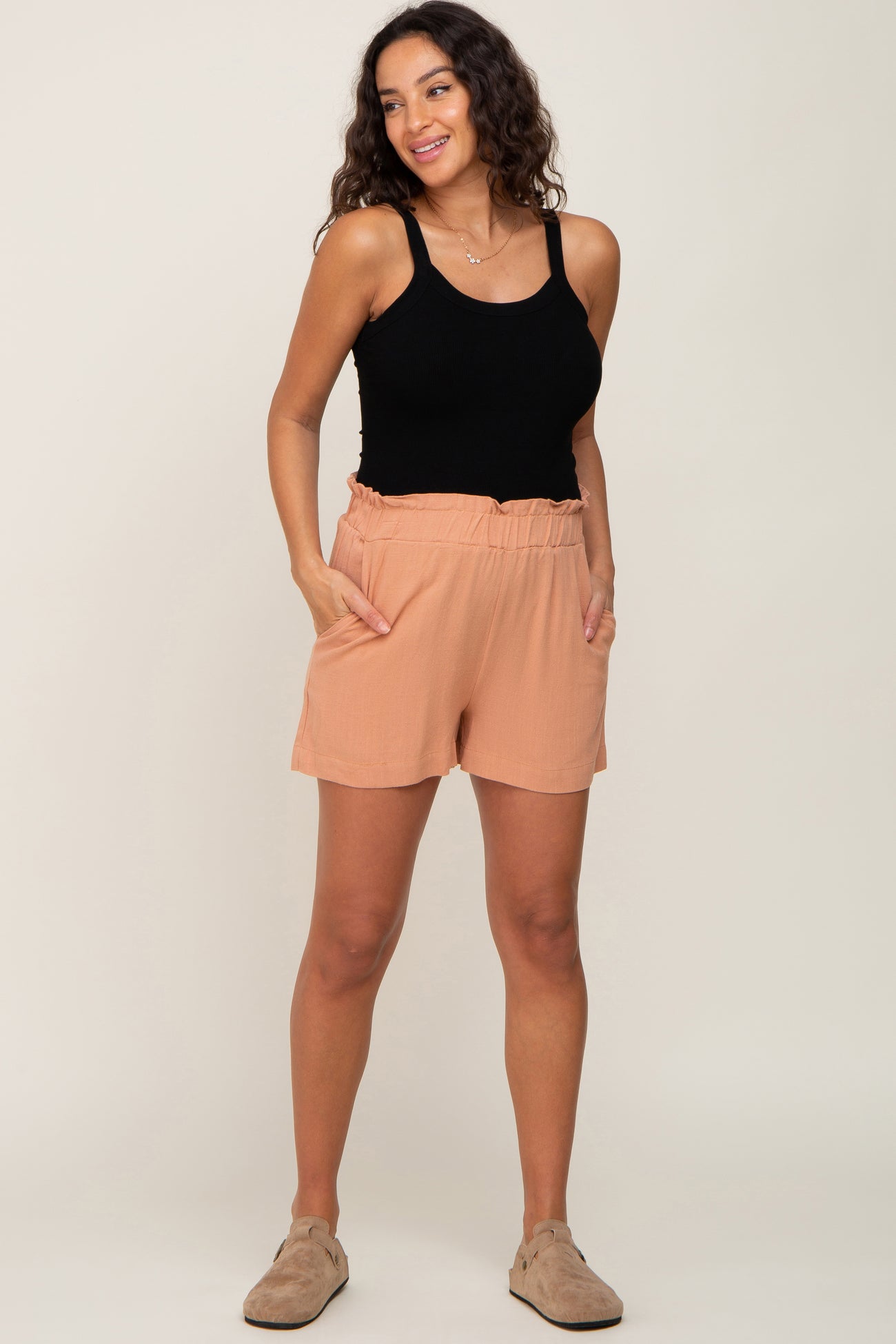 Peach Elastic Waist Linen Maternity Shorts