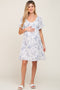 A floral print dress featuring a v-neckline, short sleeves with elastic ruffle trim on the shoulders, and empire waist and double lined.