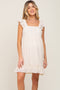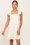 A textured sleeveless dress featuring ruffle shoulder straps, front button accents and a ruffle hem. Double lined.