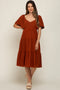 A solid maternity midi featuring short flounce sleeves, a v-neckline, a tiered skirt, and a criss cross tie back.