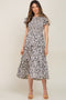 Details A printed maternity midi dress featuring a smocked elastic top with a button closure at the back, ruffle cap sleeves, and a tiered skirt with ruffle trim. Content + Care