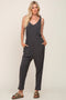 A solid sleeveless jumpsuit with adjustable straps and tapered bottoms. Pocketed.