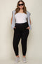 A pair of plus size joggers featuring a soft knit, side pockets, an elastic waistband, and a cuffed elastic hem.