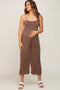A sleeveless cropped jumpsuit featuring adjustable cami straps, back smocking, wide legs and a square neckline.