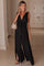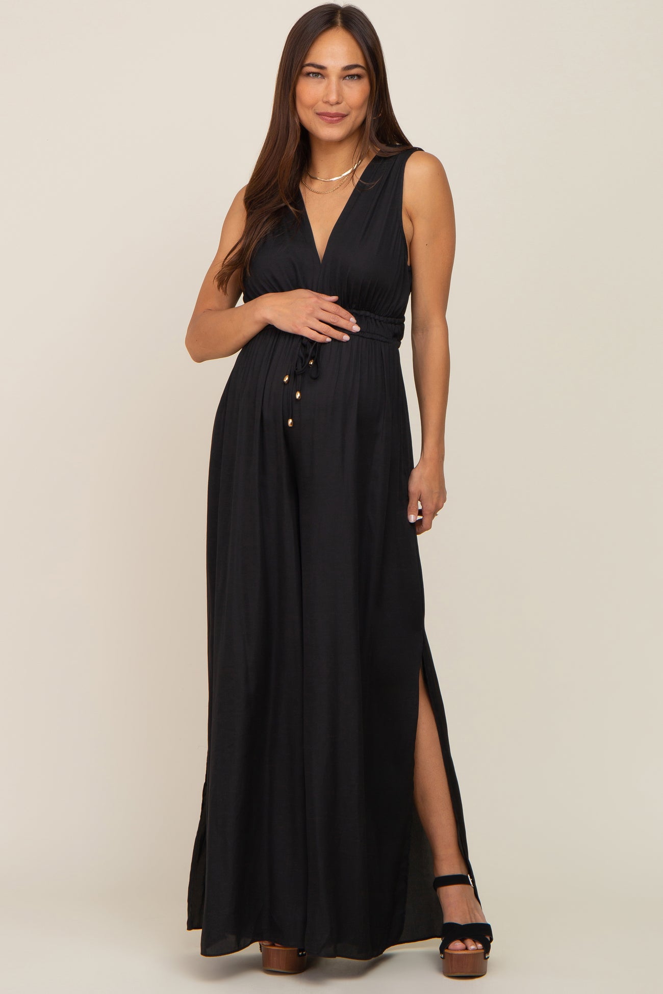 Black Satin V-Neck Side Slit Maternity Jumpsuit