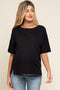 A solid hued maternity top featuring a front pocket, short sleeves, a rounded neckline and side slits.