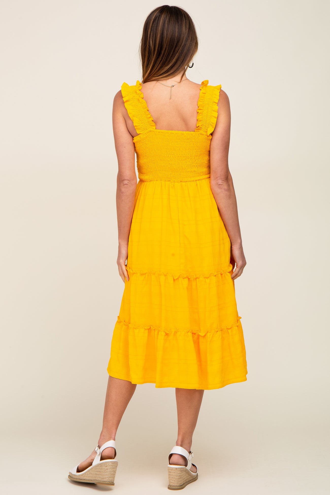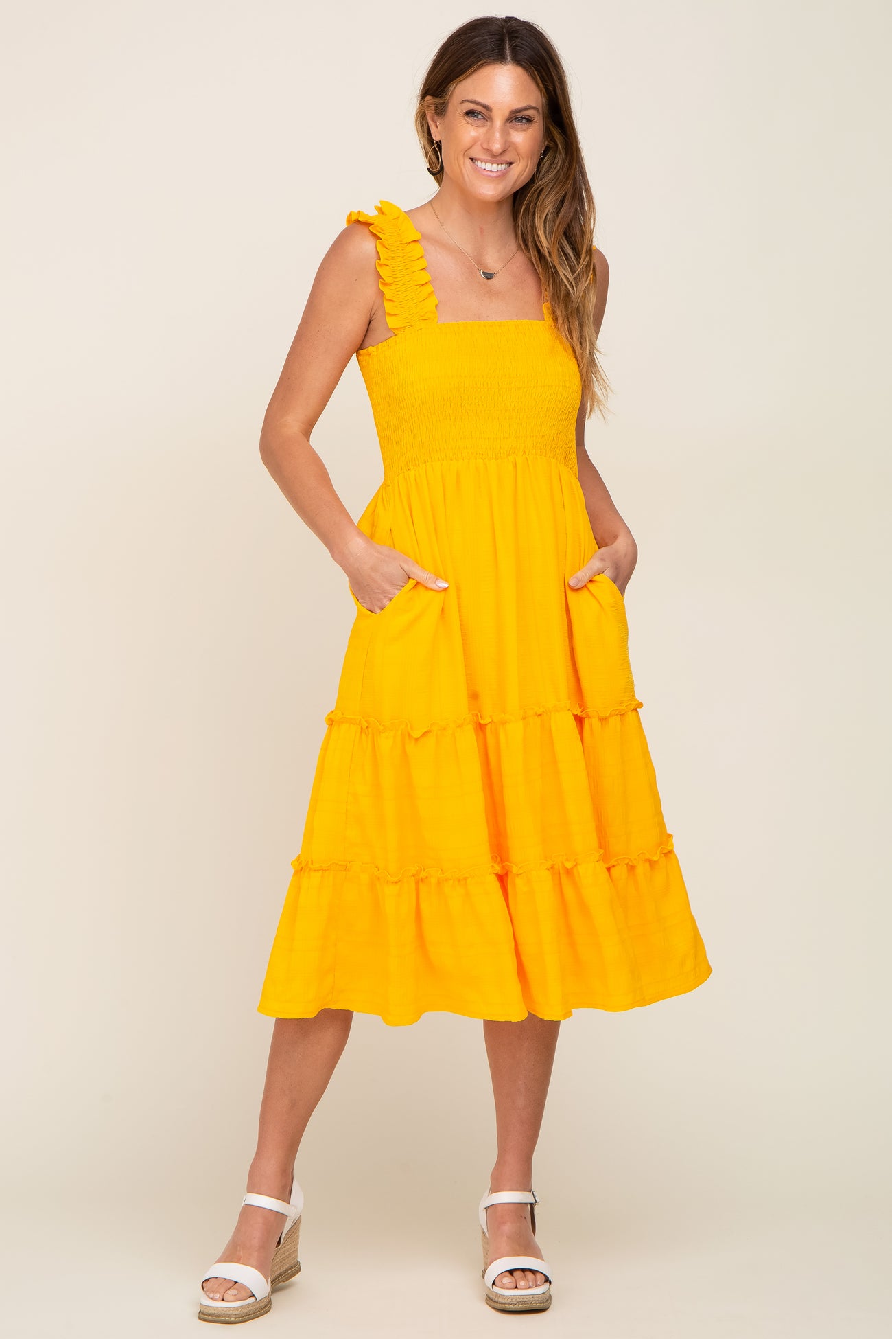 Yellow Smocked Square Neck Ruffle Strap Tiered Midi Dress