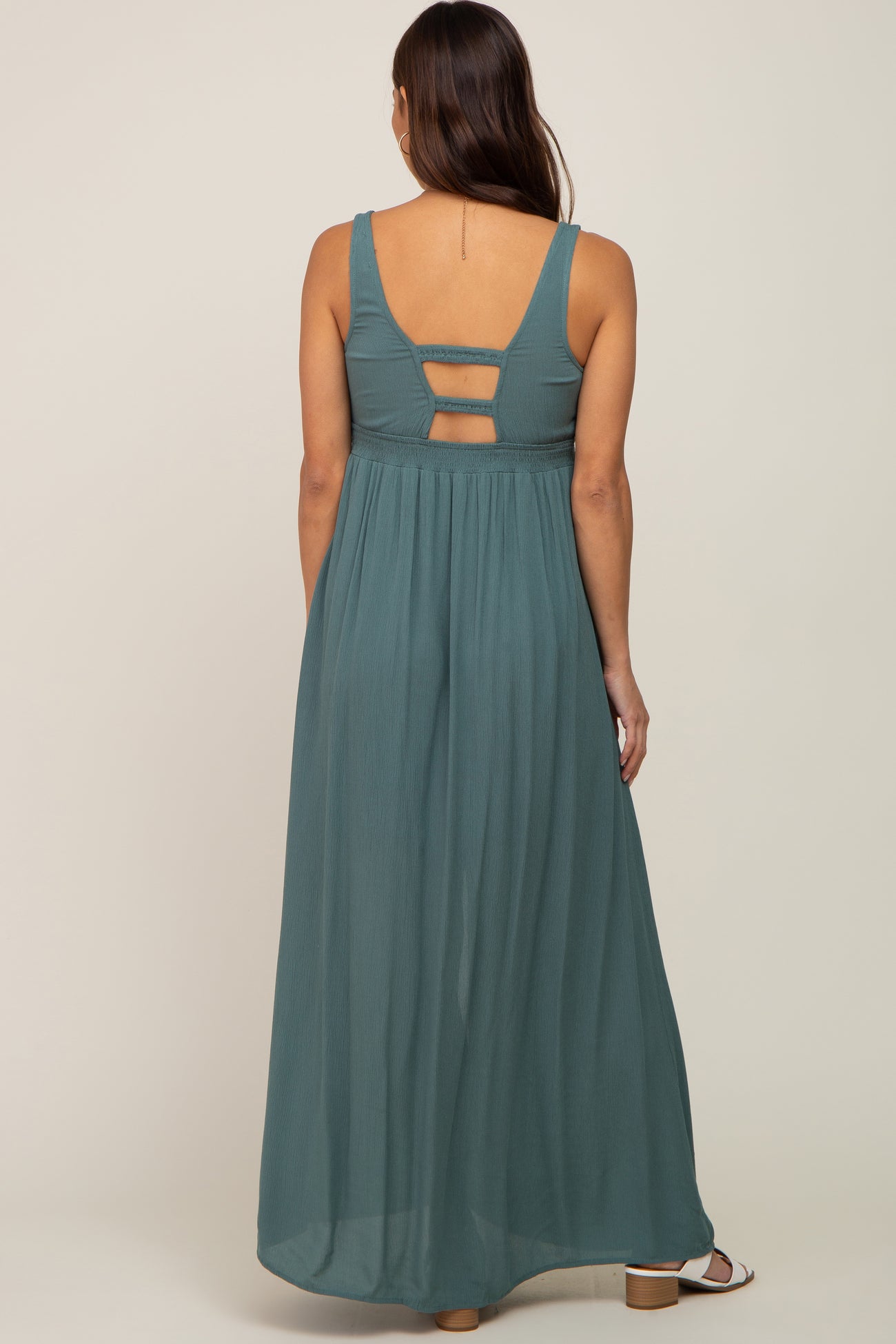A solid maternity maxi with button accents, a v-neckline, an elastic smocked waist, a front slit, and back cutout. Skirt is lined.