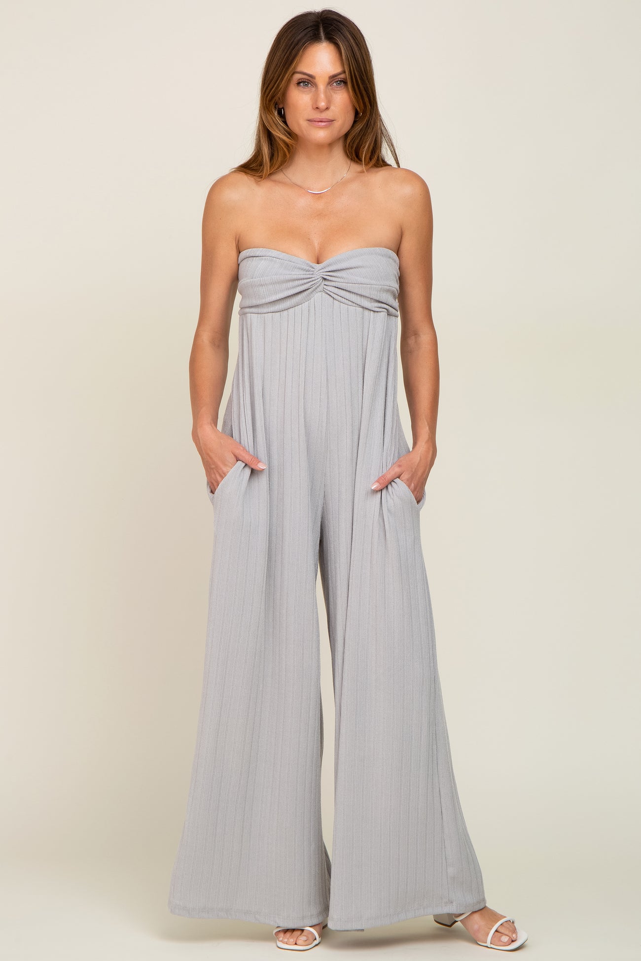 A knit jumpsuit that is strapless with a sweetheart neckline, front twist top, a smocked back, side pockets, and wide leg pants.