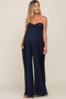 A knit maternity jumpsuit that is strapless with a sweetheart neckline, front twist top, a smocked back, side pockets, and wide leg pants.
