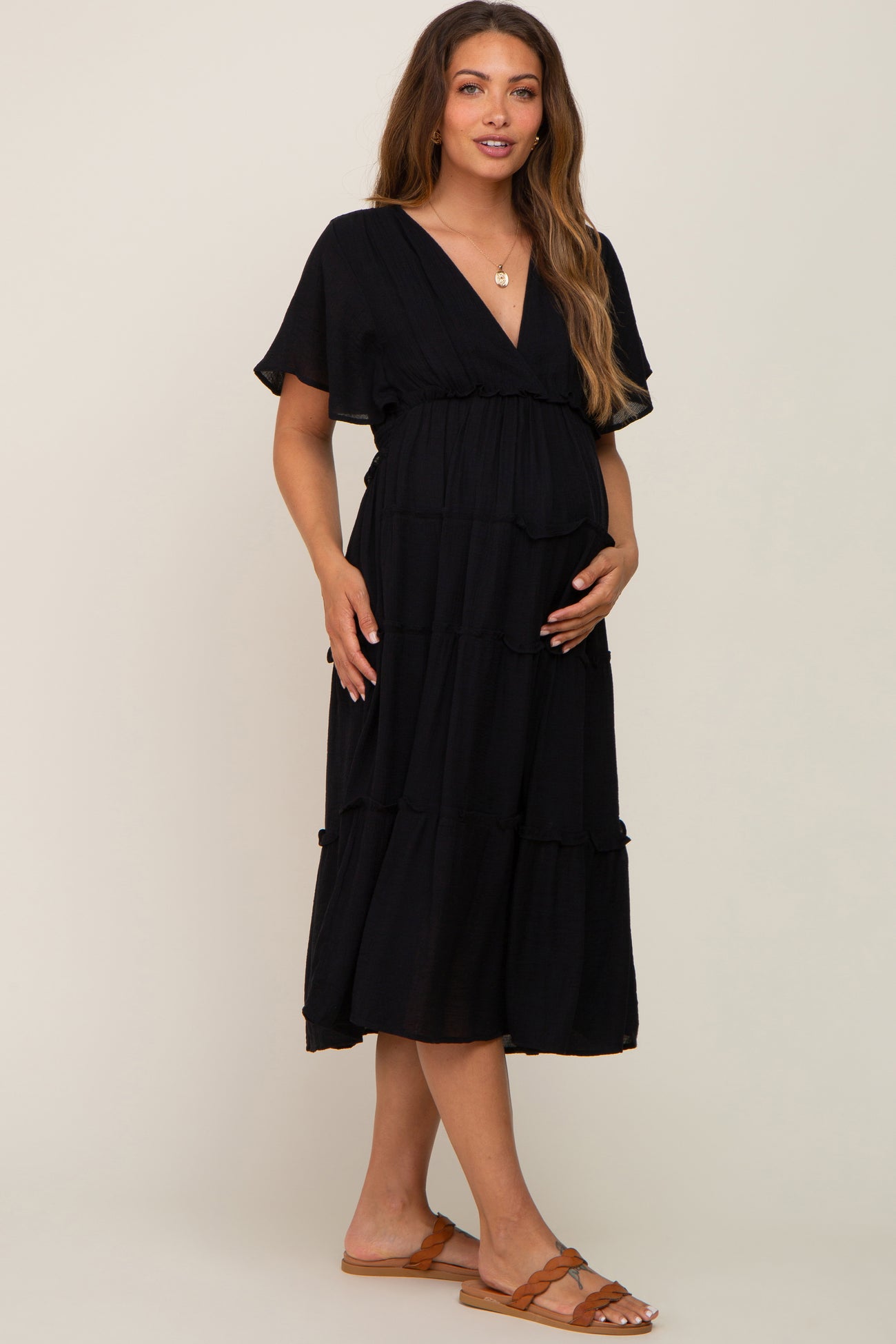 Black Ruffle Tiered V-Neck Maternity Midi Dress
