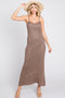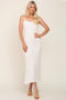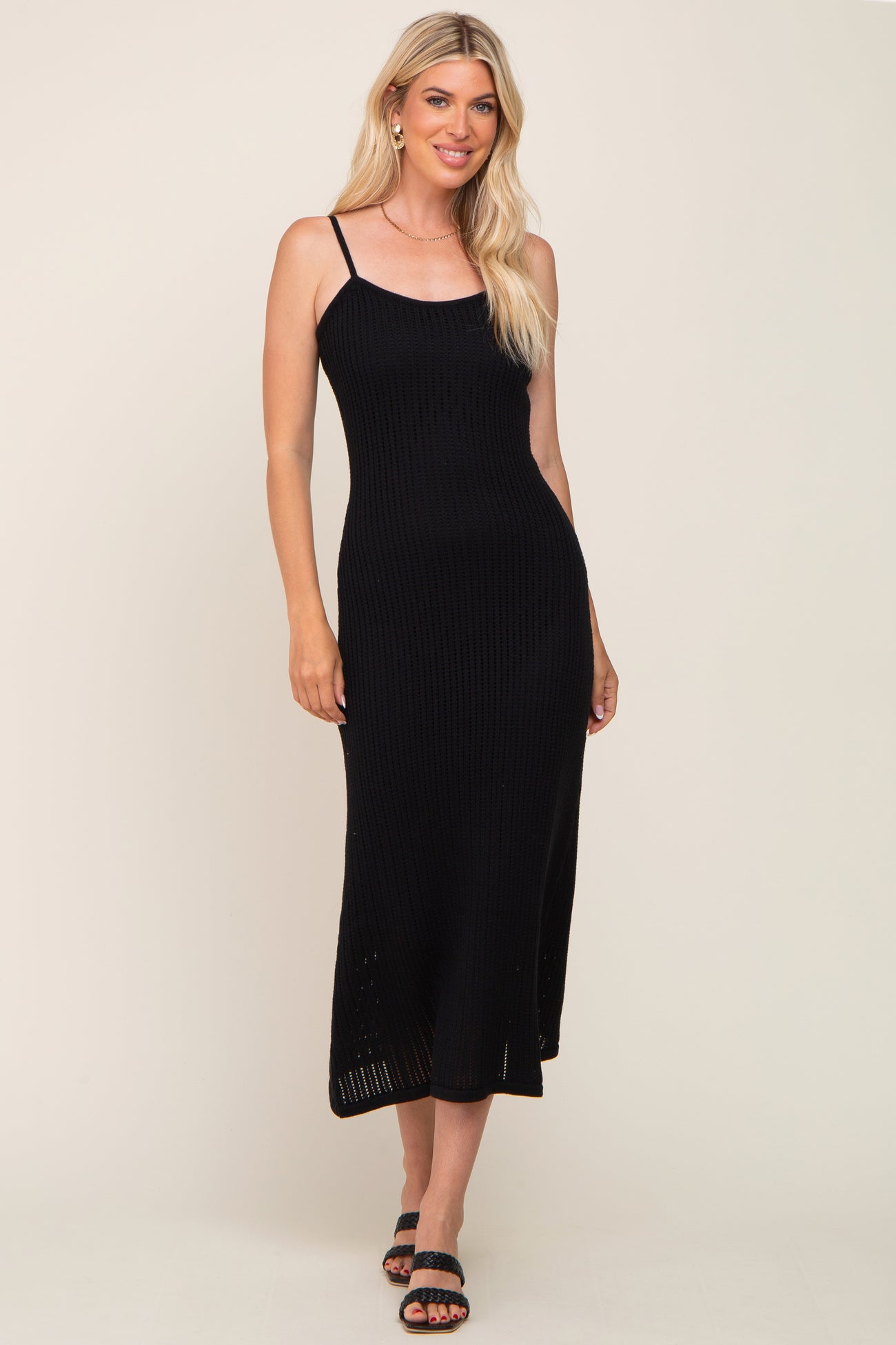 An open knit crochet dress featuring adjustable straps and a scoop neckline. Dress is lined.