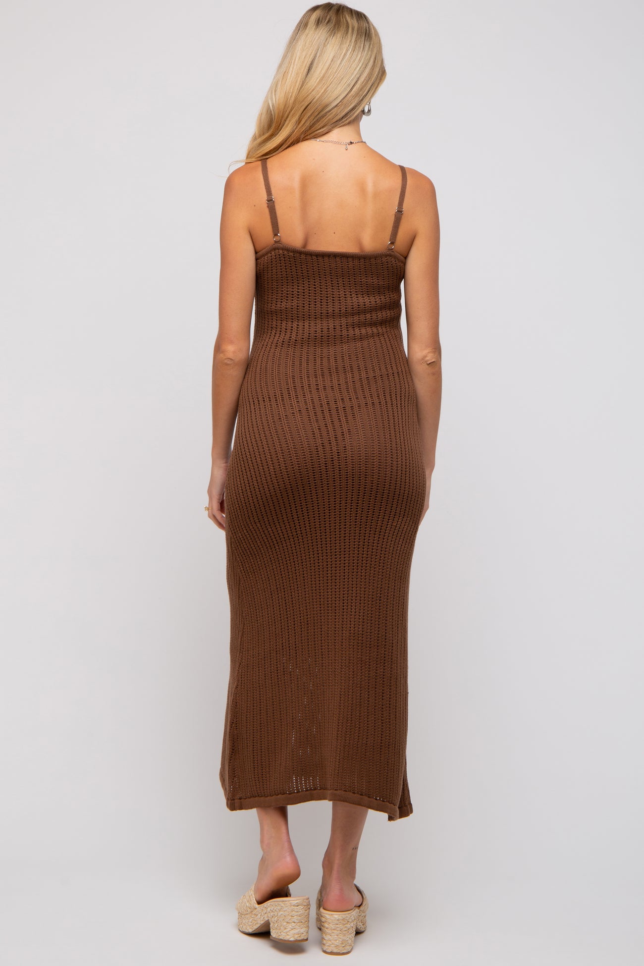 An open knit crochet maternity dress featuring adjustable straps and a scoop neckline. Dress is lined.