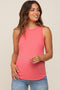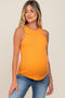 A basic solid maternity tank top in a ribbed material with a higher neckline and rounded hem.
