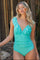 A solid hued one-piece swimsuit, featuring a deep v-neckline, adjustable straps with ruffle detailing, ruched sides, removeable padded cups and a double lining.