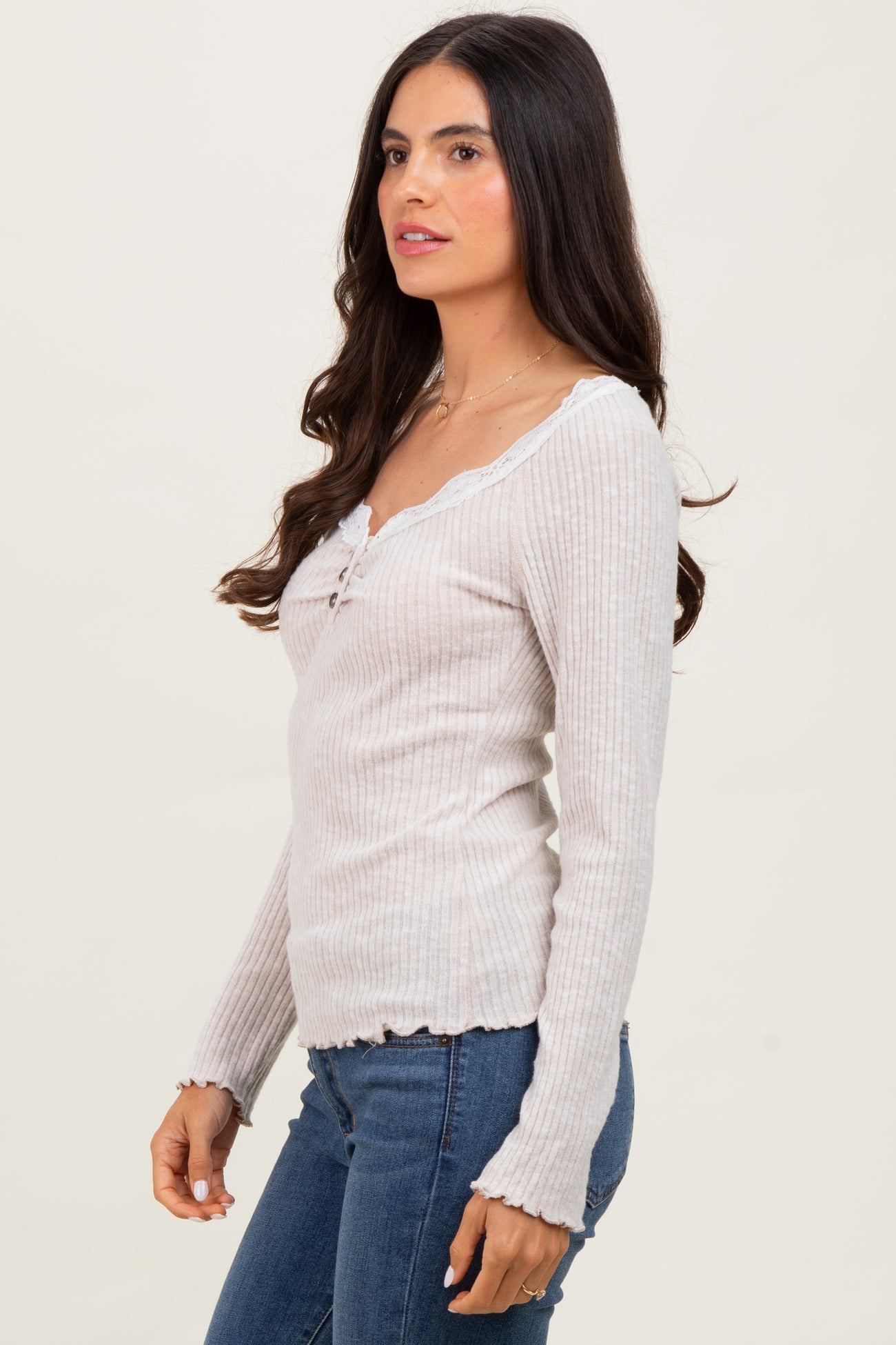 Elevate your casual wardrobe with our Beige Brushed Rib Lace Trimmed Henley Top. Crafted from a soft, brushed rib fabric, this long-sleeve top offers cozy comfort and a flattering fit. The delicate lace trim around the neckline adds a feminine touch, perfectly complemented by the subtle ruched detail and three-button Henley placket. Finished with lettuce-edge hems on the sleeves and bottom, it’s ideal for layering or wearing alone. Pair this versatile, stylish top with your favorite jeans or skirts for effortlessly chic everyday looks. Available in sizes XS to XL.