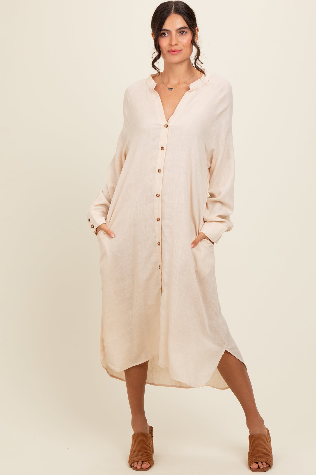 Beige Button Down Midi Dress