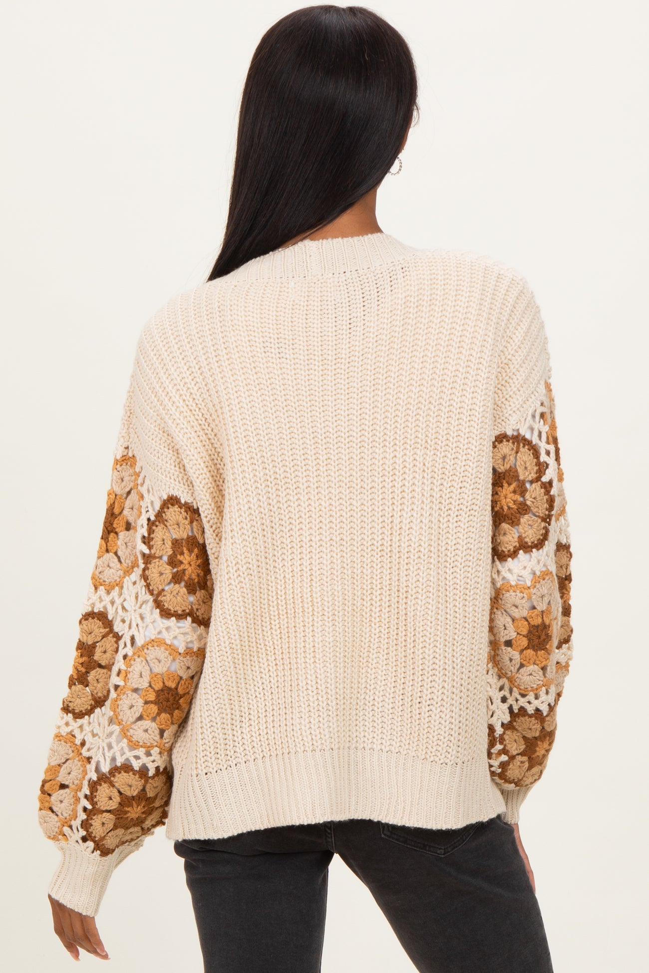 Elevate your cozy style with our Beige Crochet Detail Sleeve Cardigan. This open-front cardigan features chunky knit fabric paired with intricate crochet floral sleeves in warm earth tones, adding a charming handmade touch to your wardrobe. Its relaxed fit and soft texture make it perfect for layering over your favorite tops, whether for casual outings or snug days at home. Pair effortlessly with jeans or skirts to create a chic, boho-inspired look. Embrace comfort and unique style with this must-have cardigan that combines timeless knitwear with beautiful crochet artistry. Your go-to piece for any season!
