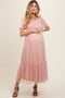 Beige Floral Embroidered Short Puff Sleeve Dress