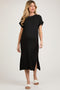 A floral print maternity midi dress featuring a square neckline, a smocked bodice, 3/4 length puff ruffle sleeves, fringe trim and a ruffle hem.