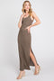 A solid ribbed maternity set. Crop top features long sleeves and a rounded neckline. Midi skirt features a side slit and elastic waist band.