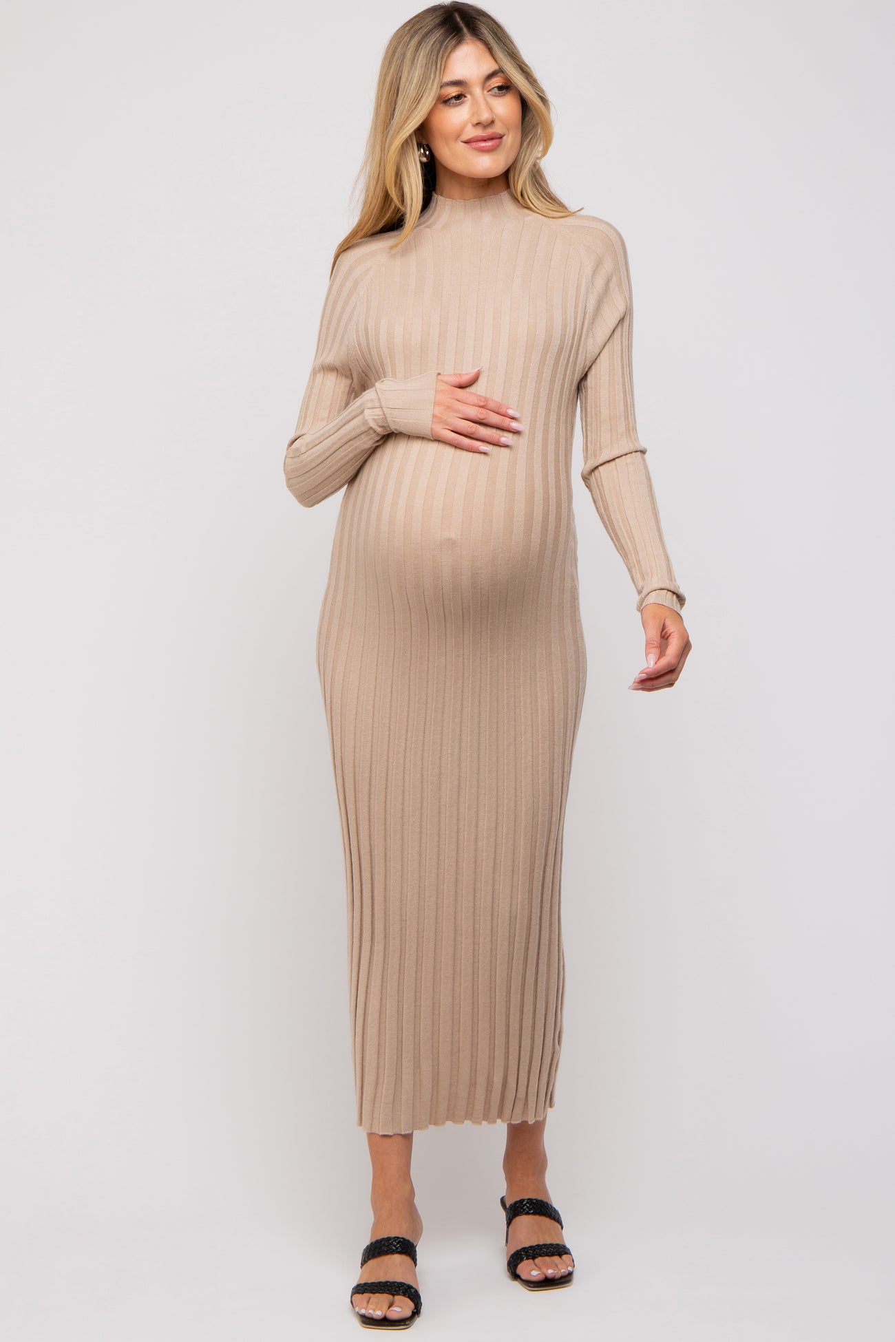 Beige Ribbed Turtle Neck Maternity Midi Dress