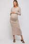 A solid rib knit midi dress featuring a rounded neckline, long sleeves, ruched sides, and a side slit.