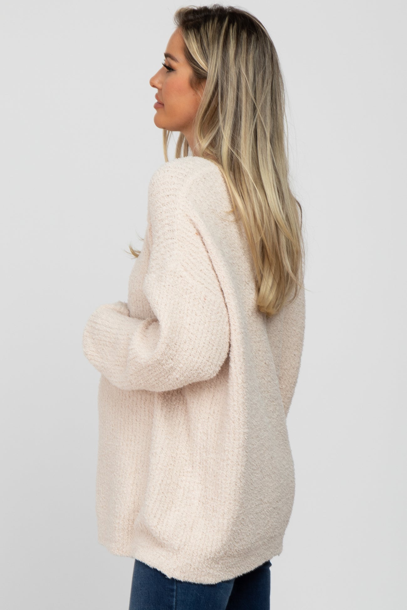 An ultra soft knit maternity sweater featuring a v-neckline and long sleeves.