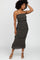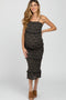 A animal printed midi dress featuring a smocked elastic body with ruffle trim, and adjustable cami straps.