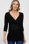 A brushed knit top featuring 3/4 sleeves and a self-tie wrap neckline.
