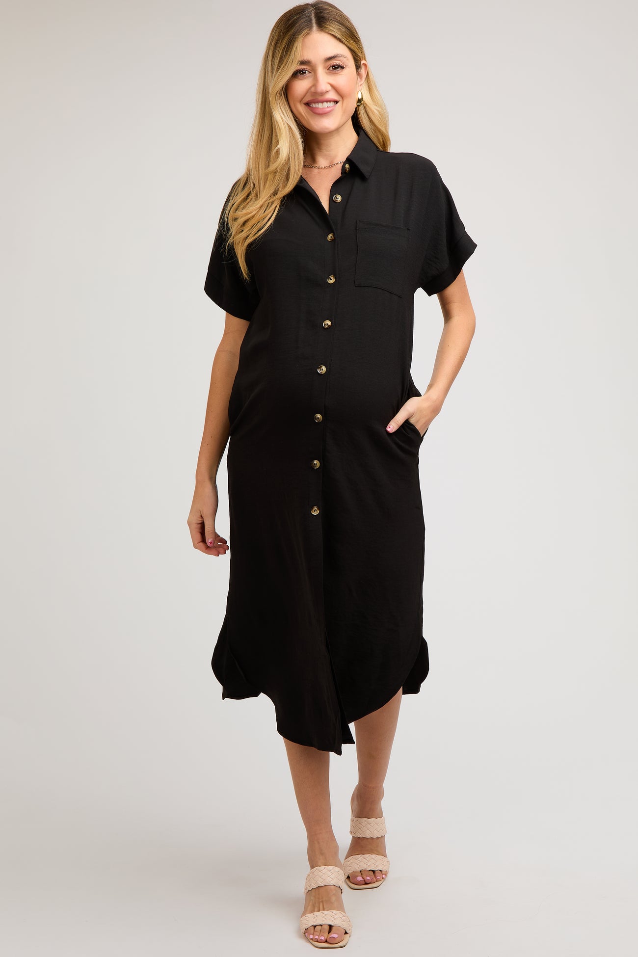 A solid hue maternity midi dress with a collar, front pocket, functioning front buttons, short dolman sleeves, side slits, and a rounded hem.