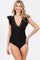 A solid hued swimsuit featuring a v-neckline, ruched sides, ruffle straps and back cutout.