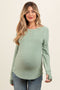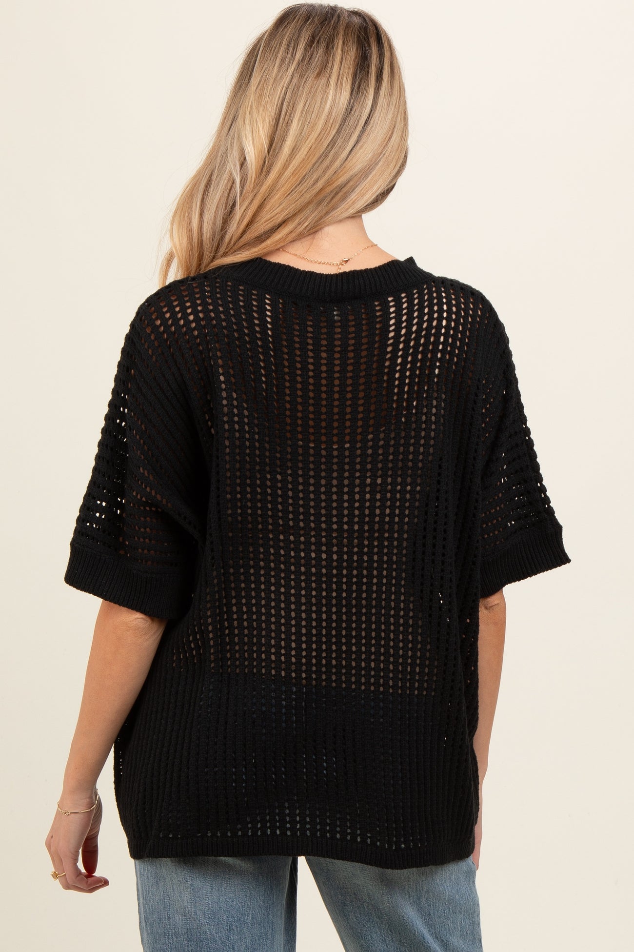 A crochet knit maternity top featuring short dolman sleeves and a rounded neckline.