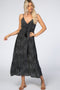 A dot print maternity midi dress featuring ruffle, crochet lace and self tie detail in front, smocked back and adjustable thin straps.