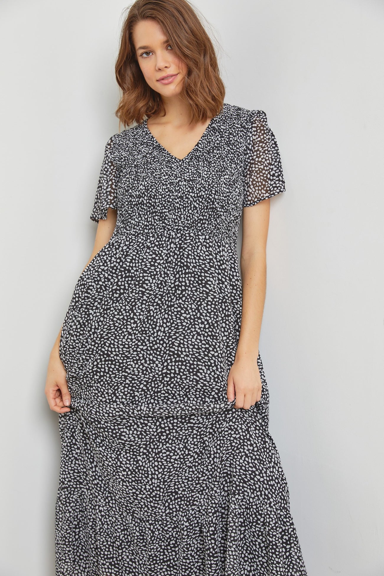 Black Dotted Smocked V-Neck Short Sleeve Maxi Dress