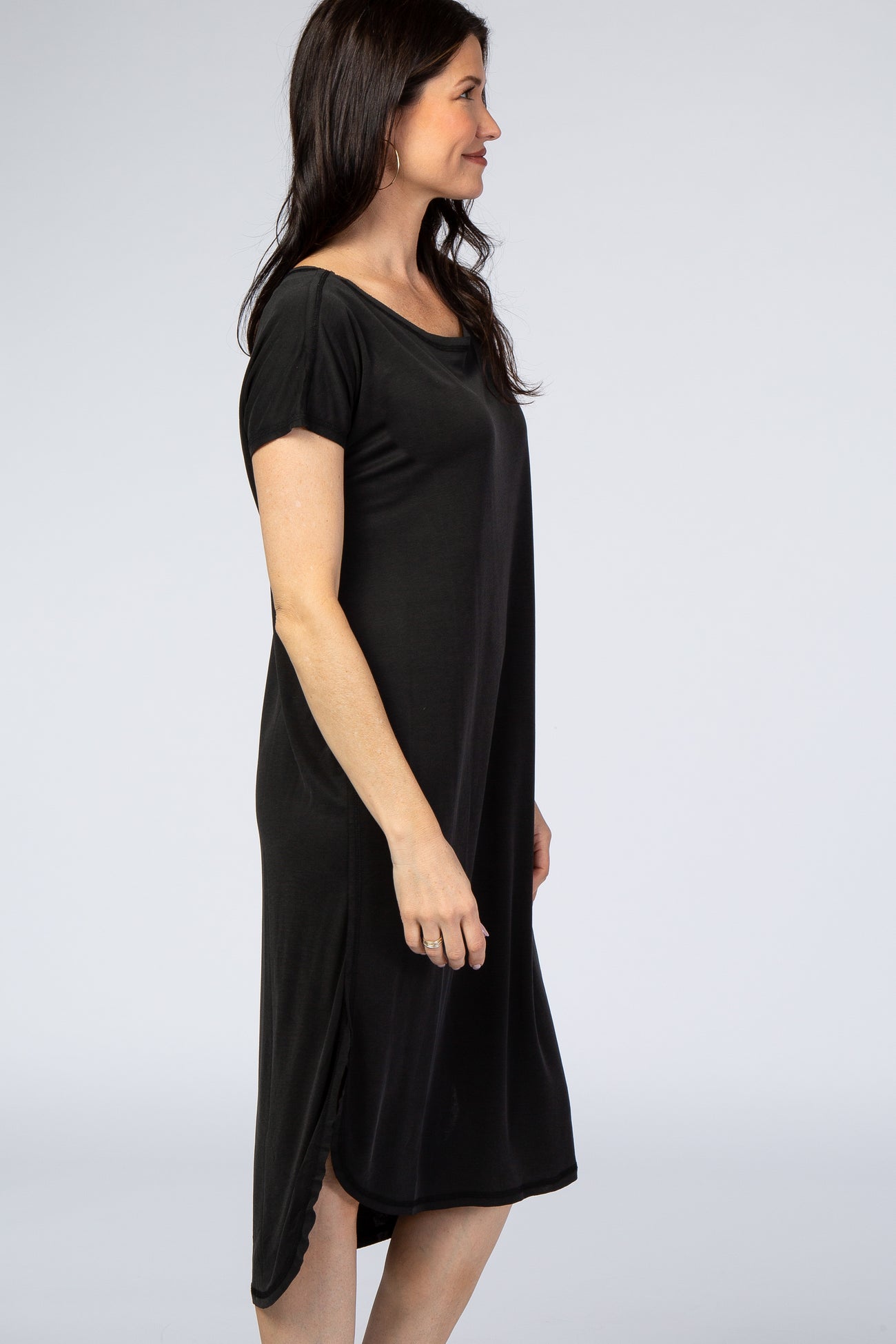 A faded midi dress featuring a raw edge, a curved hem, side slits and a rounded neckline.